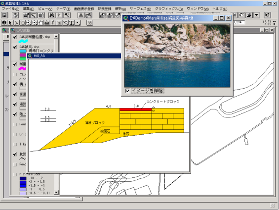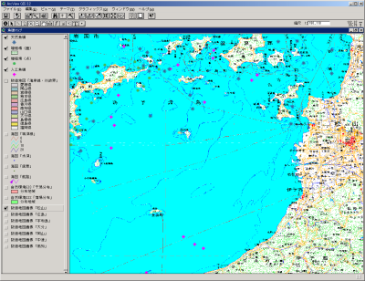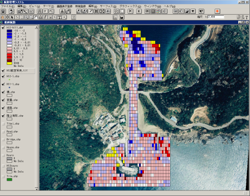 地理情報システム(GIS)の導入により、地図や航空写真等を背景として、実測データ等の地理情報とそれに付随する情報を登録することにより、地図と属性情報との視覚的な把握が可能となりました。さらに、解析ツールなどにより、コンターの作成や地図と属性データから、統計的な解析が可能となりました。これにより、時系列での変化傾向などは、より視覚的な成果品として作成することが可能となりました。 また、地理情報をもたない図面や写真等をラスター画像の補正処理により地理情報を持たせることが可能となりました。